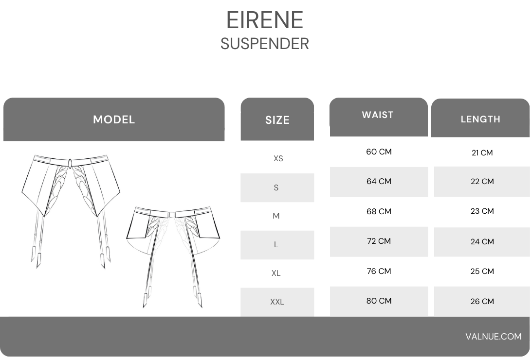 The Eirene black suspender breathes new life into the timeless accessory of suspenders. While suspenders have historically played a role in adding an enticing allure to female sexuality, Eirene takes this concept to unprecedented heights. Its design represents a perfect fusion of traditional elegance and contemporary seduction, offering a fresh perspective on the classic accessory.